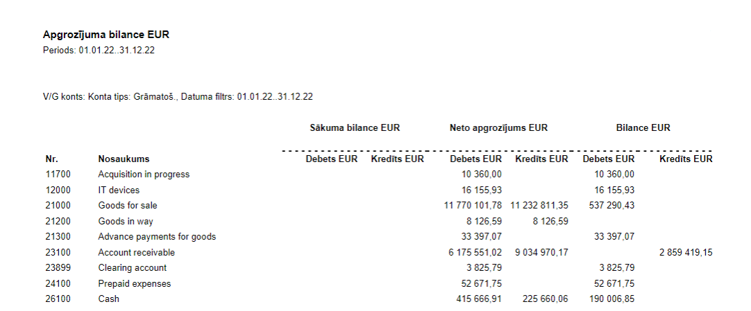 Atskaite Apgrozījuma bilance parāda virsgrāmatas kontu sākuma atlikumus, apgrozījumu norādītajā periodā un beigu atlikumus.