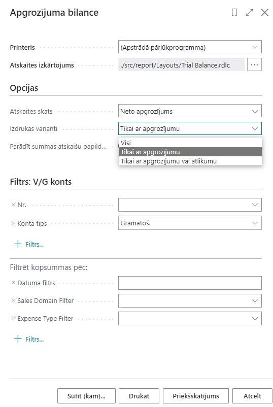 Izdrukas varianti – jāizvēlas, vai atskaitē parādīt visus kontus, tikai kontus ar apgrozījumu vai kontus, kuriem ir apgrozījums vai atlikumi;