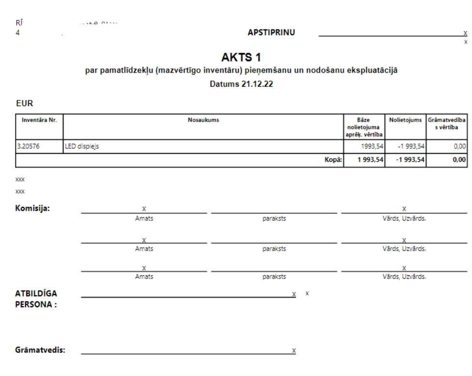 PL akta tips – Nodošana ekspluatācija. (Atskaiti izmanto arī PL vērtības izmaiņas gadījumos, norakstīšanas gadījumā, pārcenošanas gadījuma, pieņemšanas – nodošanas gadījumā);