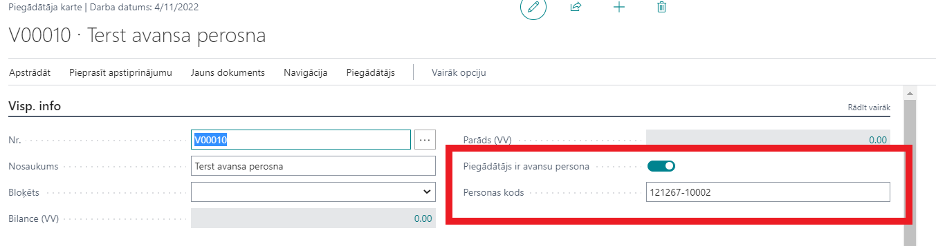 Pārbaudiet ka uzņēmuma avansa personas ir izveidotas kā piegādātāji sistēma. Piegādātāja kartiņā ir jābūt norādītai informācijai – Ir/Nav avansu persona, personas kods.