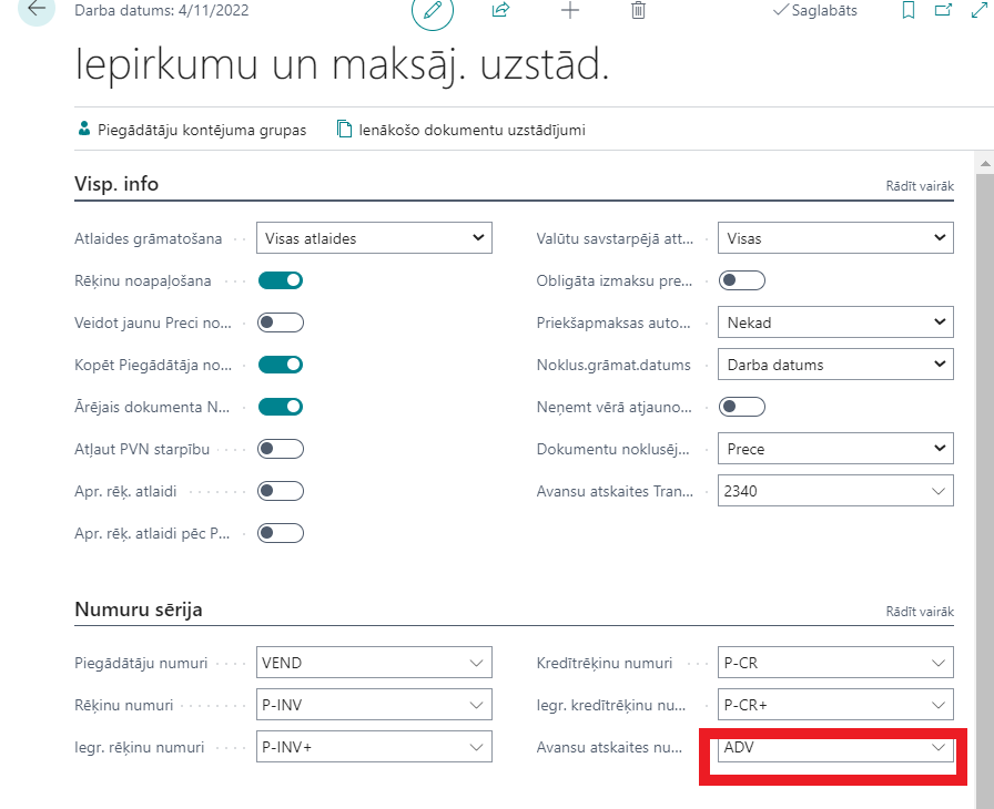 Laukā Avansu atskaites numerācija ievadiet attiecīgo num.sēriju automātiskas numerācijas piešķiršanai