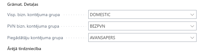 Ir nepieciešams izveidot Noklusējuma piegādātāju no kura tiks veikti visi iepirkumi zem nodokļa limita summas (pašlaik 150 EUR). Ir ieteicams attiecināt šo piegādātāju pie V/G starpkonta – tas palīdzēs izsekot vai grāmatojumi tika veikti pareizi. Starpkonta bilancei ir jābūt 0.