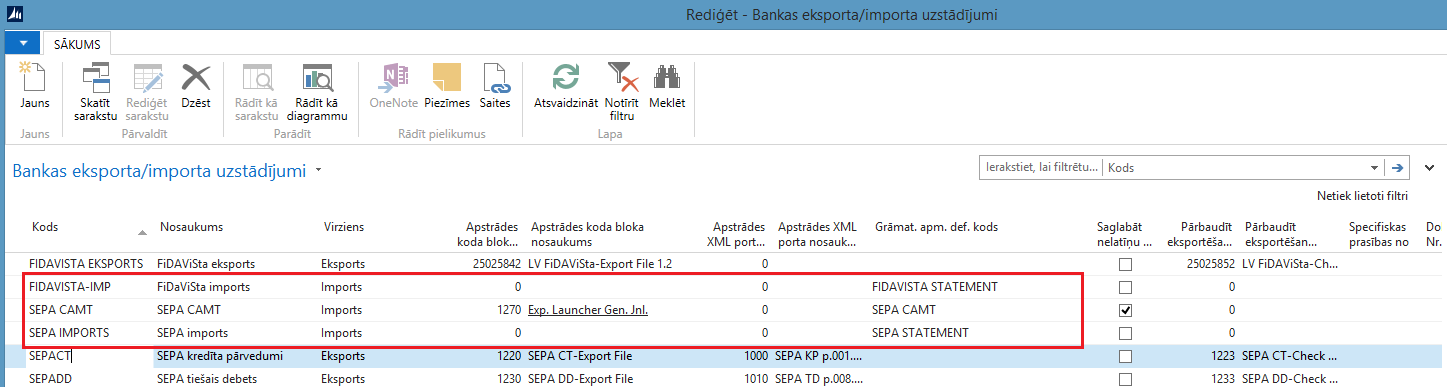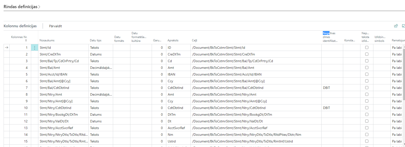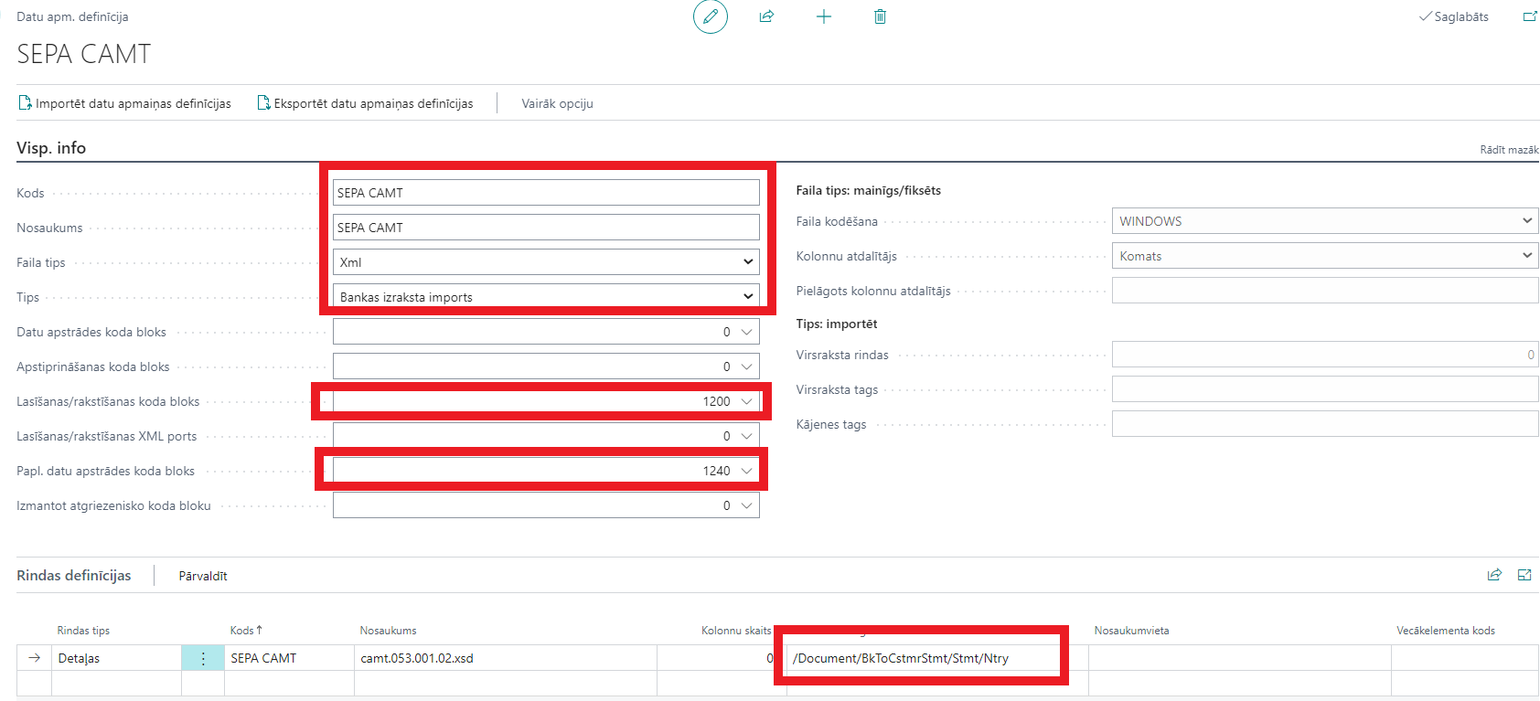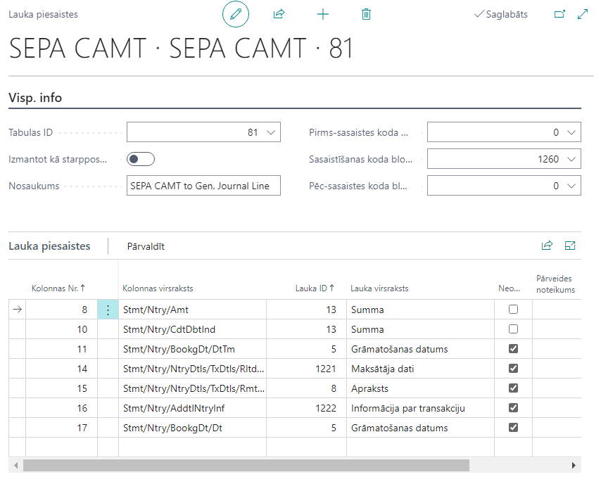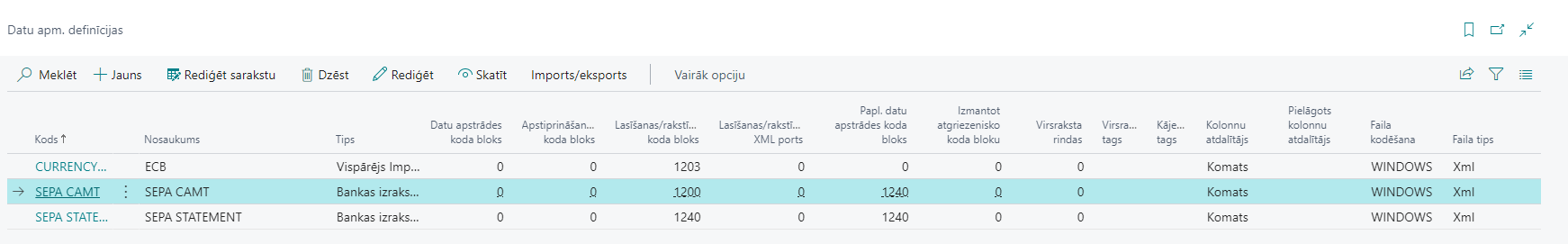 Informāciju, kā konfigurēt Datu apm.definīcijas SEPA CAMT importam skat. https://msdn.microsoft.com/en-us/library/dn495313(v=nav.80).aspx