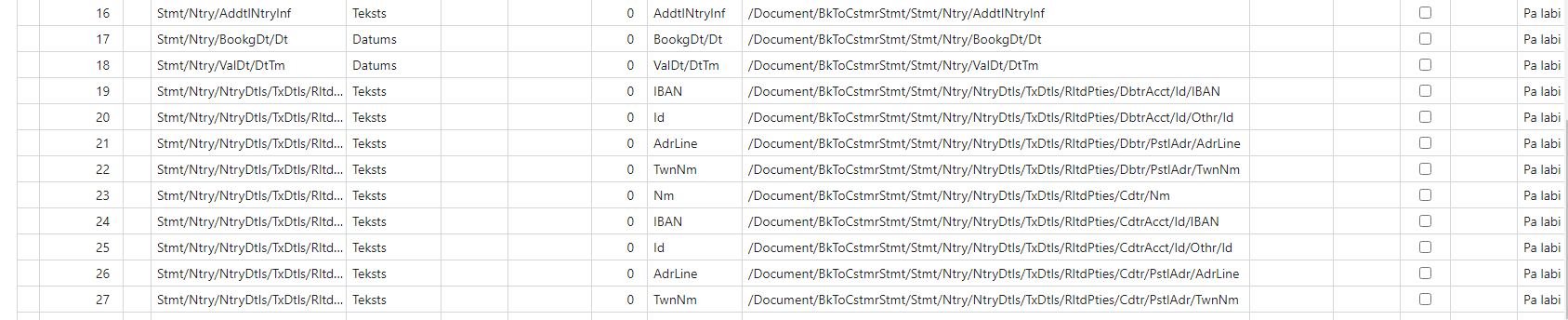 Grāmat.rindas definīcijas – jānorāda Datu rindas tags /Document/BkToCstmrStmt/Stmt/Ntry;