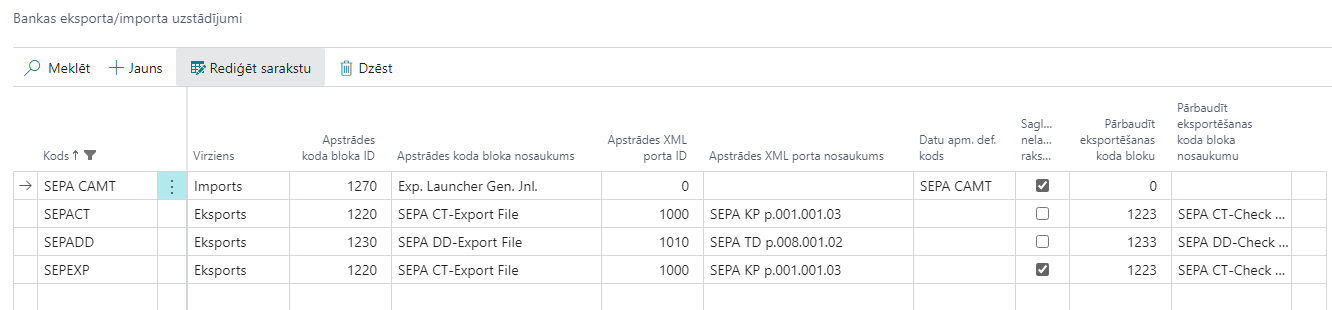Lai eksportētu maksājuma uzdevumus SEPA formātā, jānodefinē Bankas eksporta/importa uzstādījumi, kur jāaizpilda sekojoši lauki: