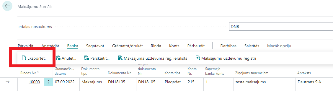 Maksājuma eksporta formāts – jānorāda iepriekšējā solī izveidotais Bankas eksporta/importa uzstādījuma kods;