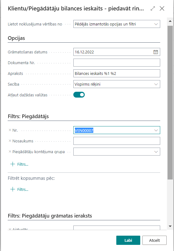 Pēc nepieciešamības iespējams uzstādīt, kuriem piegādātājiem un kurus piegādātāju grāmatas ierakstus iekļaut ieskaitā.