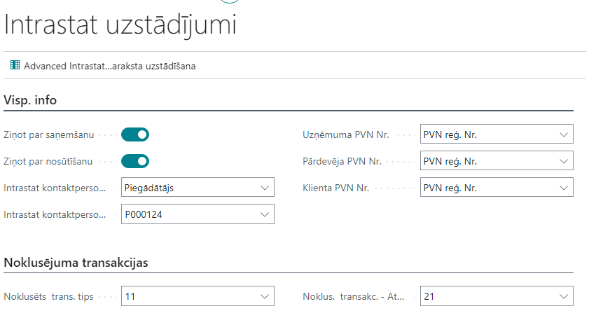 Lai Business Central sagatavotu Intrastat pārskatu atbilstoši Latvijas Centrālās statistikas pārvaldes noteiktajām prasībām, ir nepieciešami sekojoši uzstādījumi: