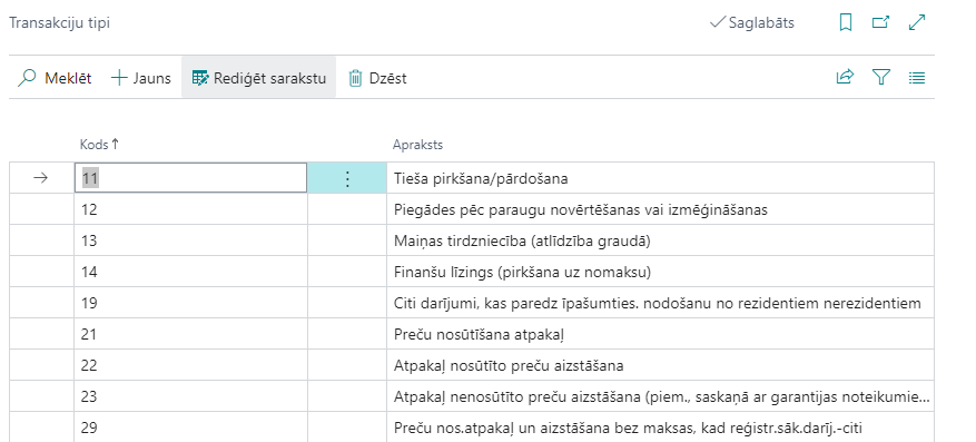 Lapā Transakciju tipi jānorāda darījumu veidu kodi.