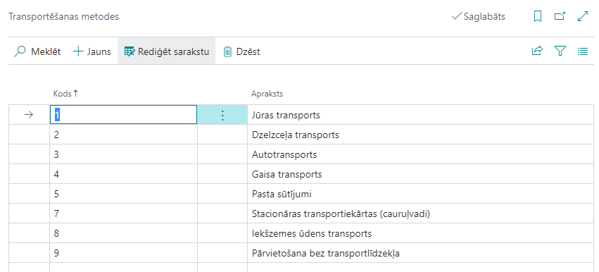Lapā Transportēšanas metodes ievada transporta veida kodus un to aprakstus.