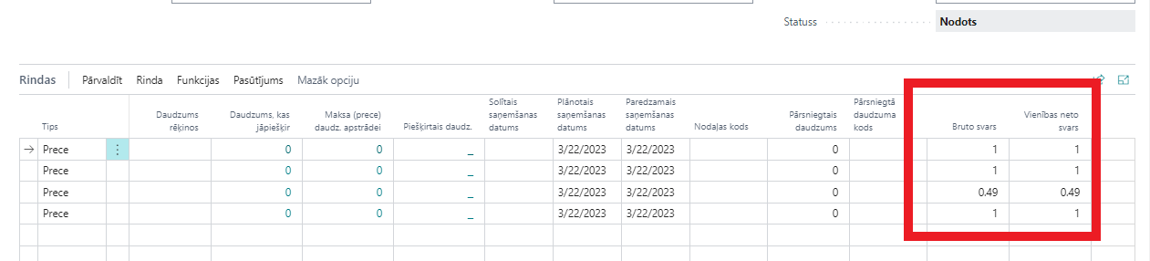 Ja vienai un tai pašai precei bruto un neto svars var atšķirties dažādām piegādēm, tad iepirkuma un pārdošanas dokumentu rindās iespējams norādīt Bruto un Neto svaru.