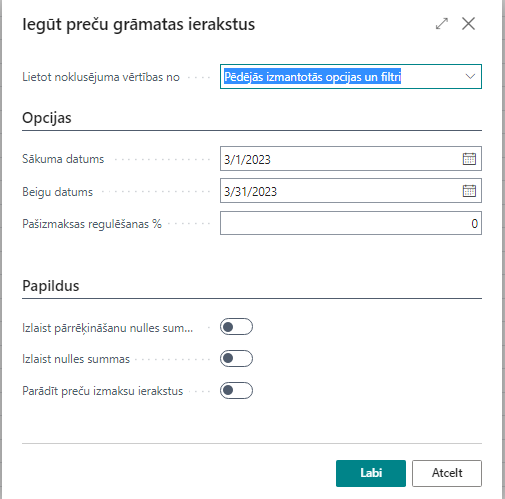 Lai Intrastat žurnālā izveidotu rindas, jāizmanto funkcija Piedāvāt rindas. Ja žurnāla iedaļai ir norādīts statistikas periods, tad sākuma un beigu datums pieprasījuma lapā jau būs aizpildīti.
