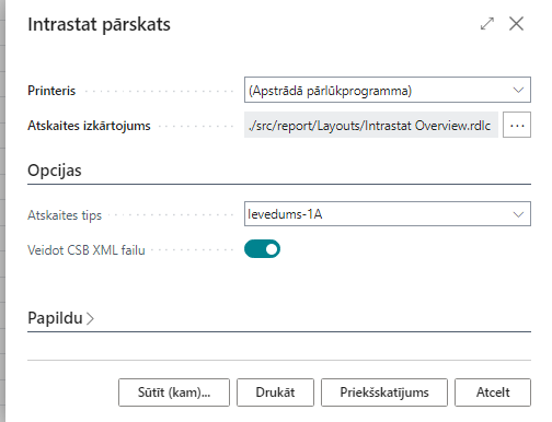 Lai izdrukātu nepieciešamos Intrastat pārskatus, kā arī sagatavotu failu importam Centrālās statistikas pārvaldes sistēmā, jāizmanto funkcija Drukāt Intrastst atskaiti (1A, 2A, 1B, 2B).