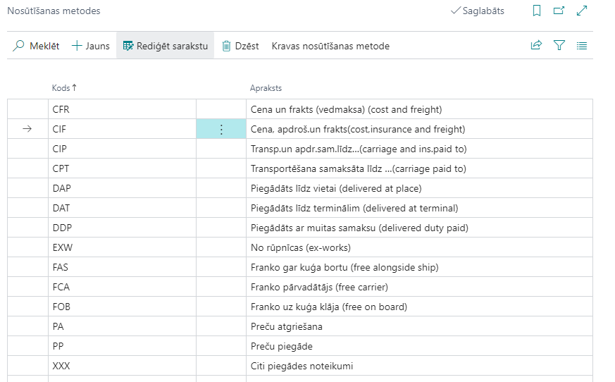 Lapā Nosūtīšanas metodes norāda preču piegādes nosacījuma kodus atbilstoši Incoterm: