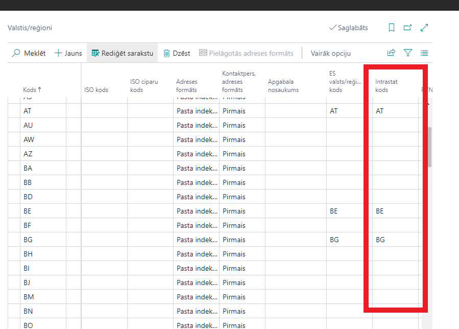 Lai sagatavotu Intrastat pārskatu, ES dalībvalstīm ir jānorāda Intrastat kods. Preču saņemšana no valstīm un nosūtīšana uz valstīm, kurām nav aizpildīts Intrastat kods, netiek iekļauta Intrastat darījumos un šiem darījumiem netiek kontrolēta Intrastat parametru aizpildīšana atbilstoši Intrastat uzstādījumiem.