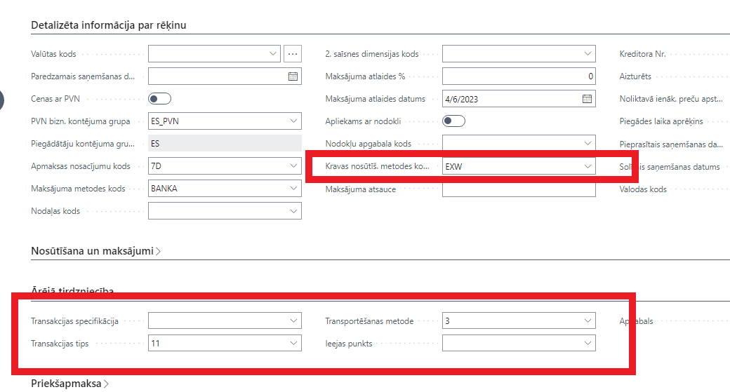 Lai sagatavotu Intrastat pārskatus, ievadot rēķinus ir jānorāda Transakcijas tipi, Transportēšanas metodi un Kravas nosūtīšanas metodi
