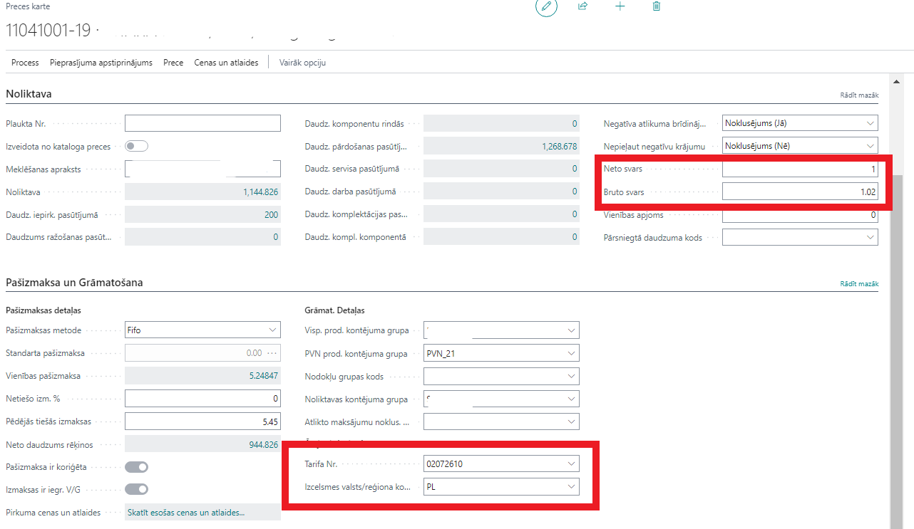 Lai sagatavotu Intrastat pārskatus, preču kartiņās nepieciešams norādīt tarifa numuru, izcelsmes valsti, neto un bruto svaru.