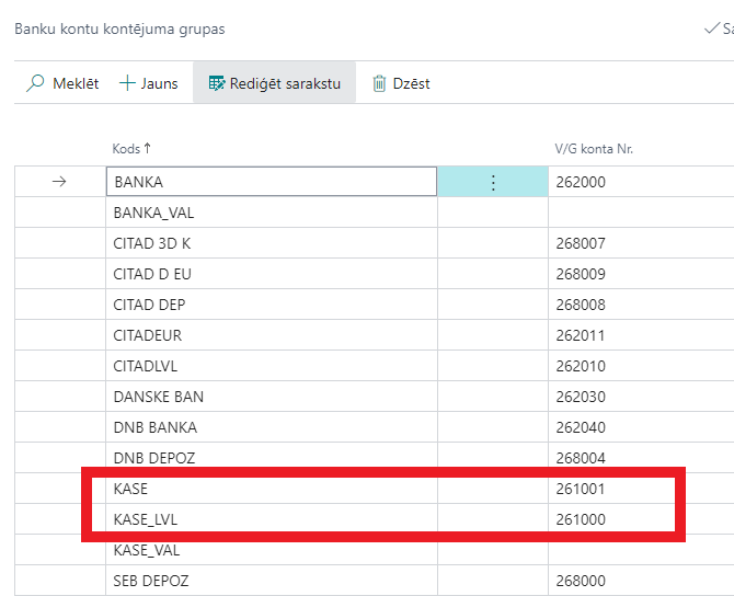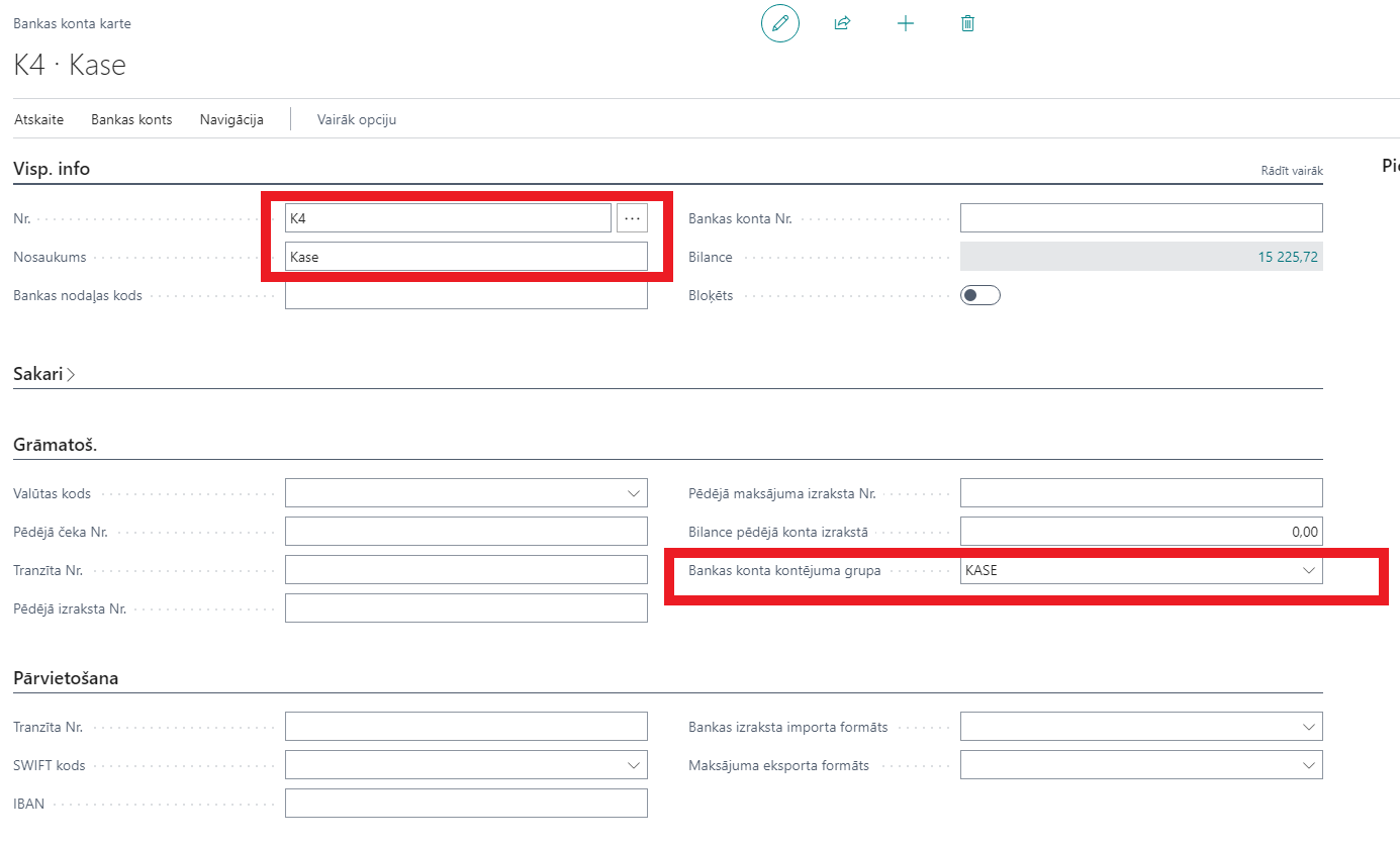 Bankas konta kontējuma grupa – jānorāda bankas konta kontējuma grupa, kas nodrošinās kases darījumu iegrāmatošanu nepieciešamajā virsgrāmatas kontā. Parasti kasēm tiek veidota atsevišķa kontējuma grupa (-as).