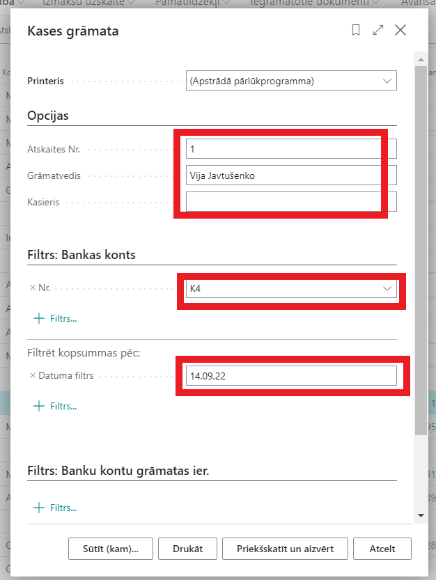 Lai izdrukātu Kases grāmatu, visiem kases darījumiem par attiecīgo periodu ir jābūt iegrāmatotiem.