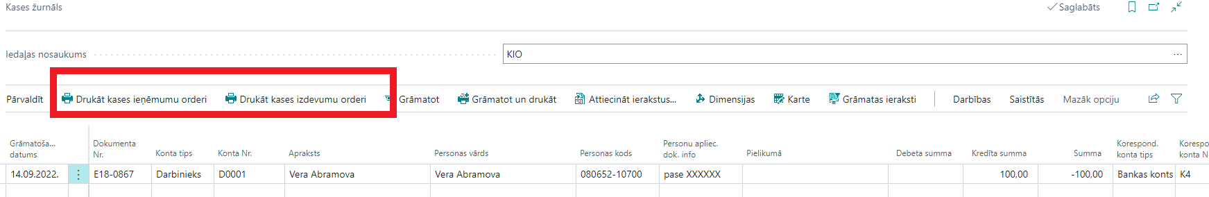 Pēc ordera sagatavošanas to var izdrukāt palaižot attiecīgi atskaiti Drukāt kases izdevumu orderi vai Drukāt kases ieņēmumu orderi.
