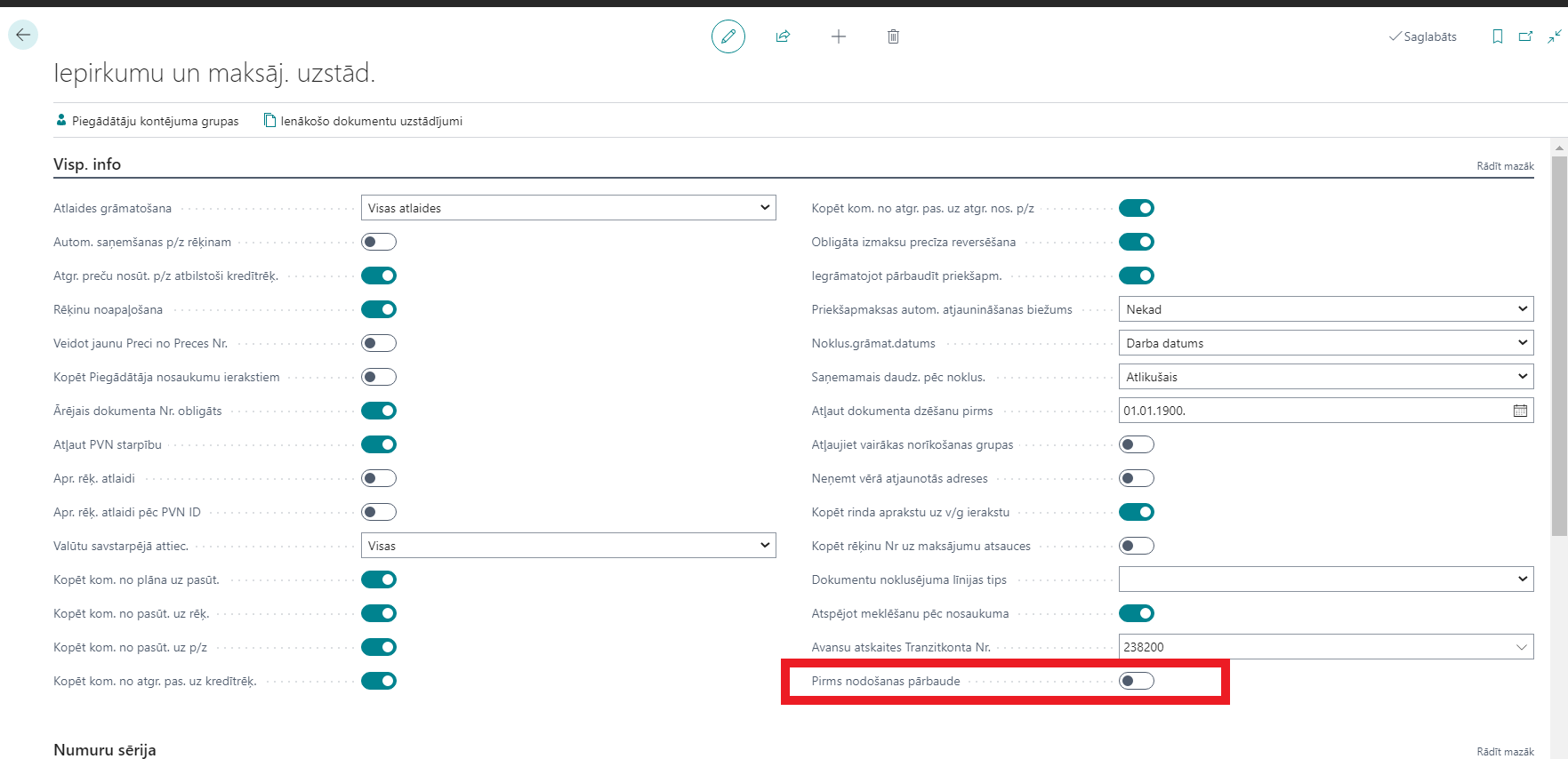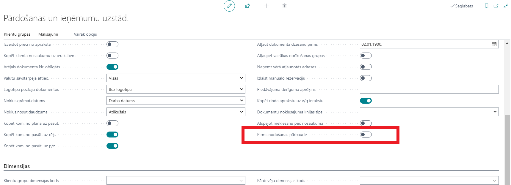 Lokalizācijas ietvaros pēc nepieciešamības lietotājs var aktivizēt Pirms nodošanas funkcionalitāti nospiežot Jā Ieņēmumu un maksāj. uzstādījumos vai/un Pārdošanas un ieņēmumu uzstādījumos.