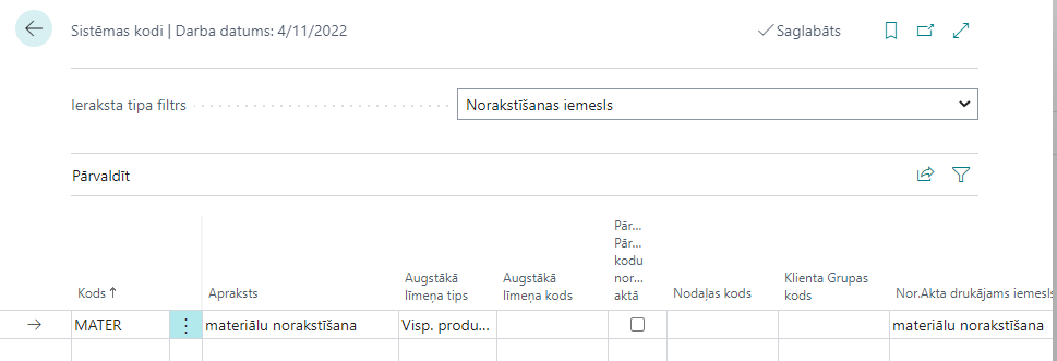 Ieraksta tipa filtrs – jāizvēlas Norakstīšanas iemesls.