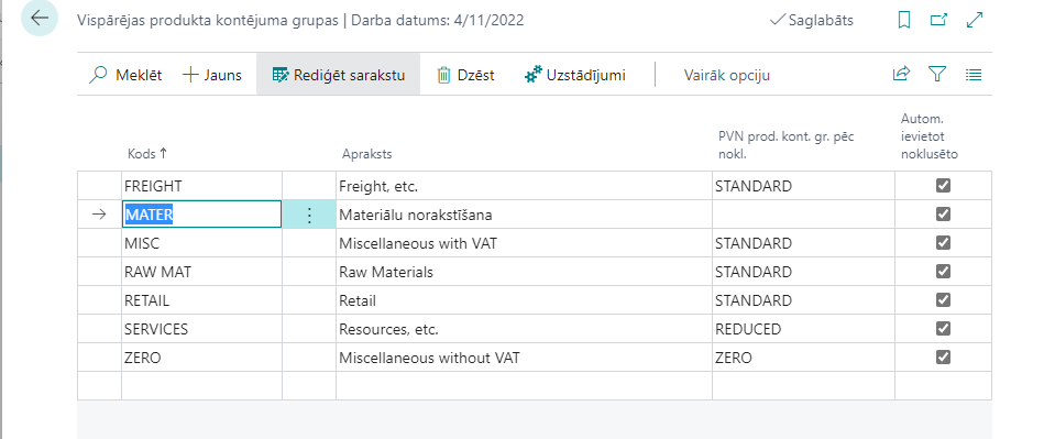 Jūs varat izveidot speciālas visp. produkta kontējumu grupas aktu grāmatošanai. Grupas un uzstādījumu izveidošana notiek sekojoši:
