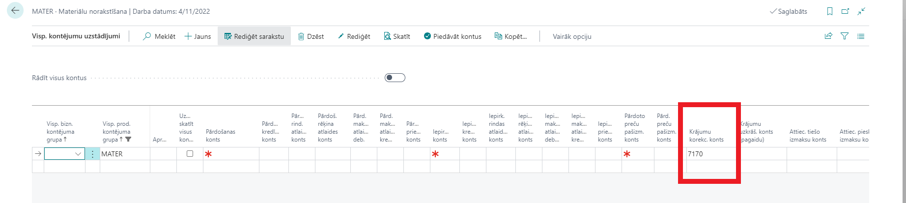 Ailē Krājumu korekcijas konts norādiet V/G kontu, kur nepieciešams uzskaitīt norakstāmo preču pašizmaksu