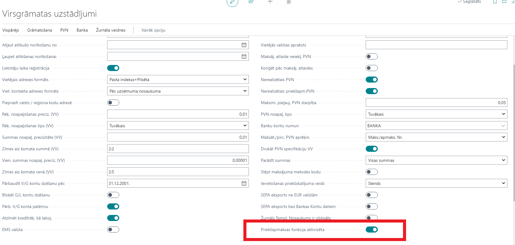 Pirms veikt uzstādījumus Priekšapmaksas modulī ir nepieciešams aktivizēt Priekšapmaksas funkcionalitāti nospiežot Jā Virsgrāmatas uzstādījumos Priekšapmaksas funkcija aktivizēta logā.