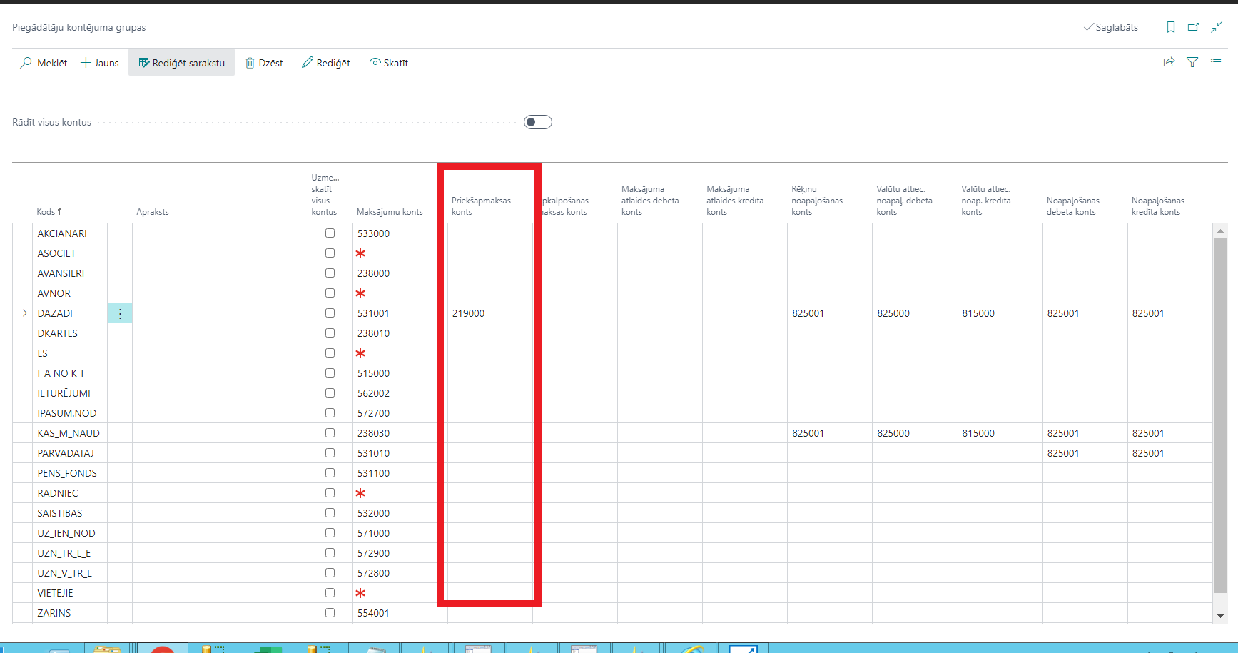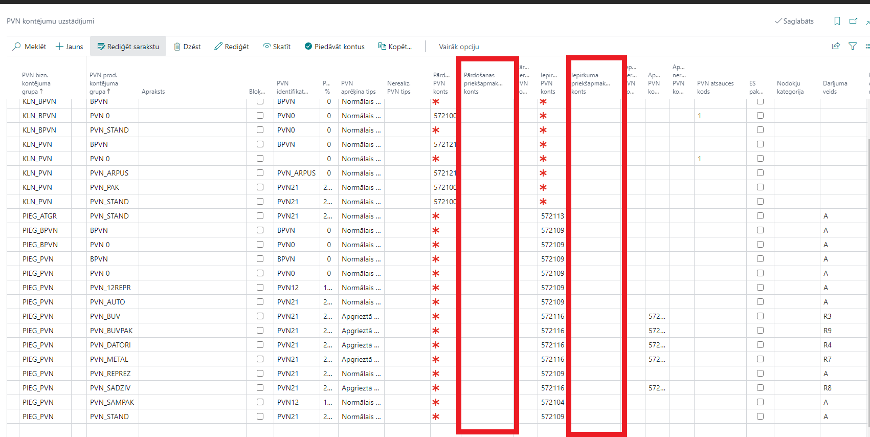 Gadījumos kad priekšapmaksas PVN summas tiek uzskaitītas atsevišķos V/G kontos tad nepieciešams papildināt PVN kontējumu uzstādījumus – ielikt Iepirkumu un Pārdošanas priekšapmaksas kontus, kā parādīts Ilustrācijā 7-4.