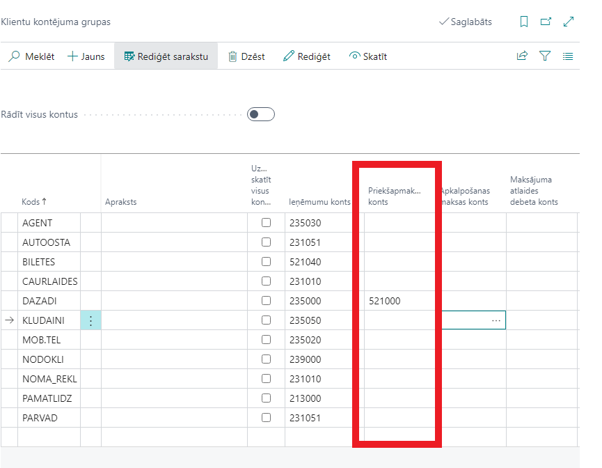 Pēc funkcionalitātes aktivizācijas ir nepieciešams uzstādīt grāmatojumiem nepieciešamus V/G kontus attiecīgajos uzstādījumos. Priekšapmaksas konts – Klientu un Piegādātāju kontējumu uzstādījumos, kā parādīts Ilustrācijās 7-2 un 7-3.