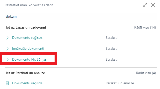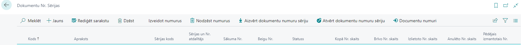 Ja ir nepieciešams atvērt aizvērtu sēriju, tad ir jāizmanto funkcija Atvērt dokumentu numuru sēriju. Sērijas statuss tiks nomainīts uz Aktīvs.