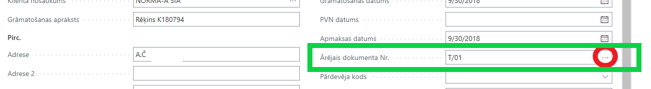 Numuru var izvēlēties, kā arī apskatīt iegrāmatotajos dokumentos laukā Ārējais dokumenta numurs/ Piegādātāja kredītrēķina Nr. Pie izvēles tiks parādītas tikai aktīvās numuru sērijas.