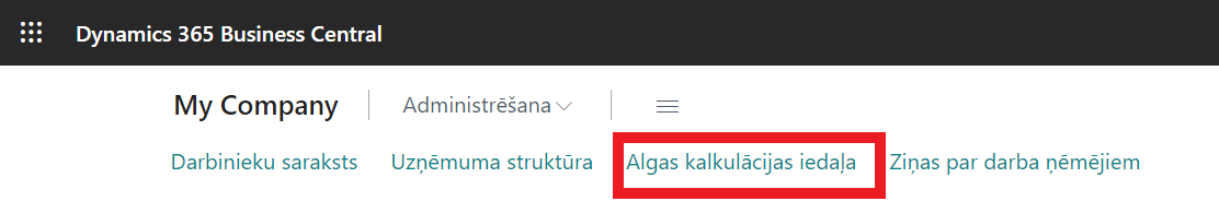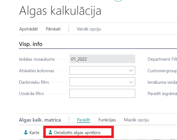 Aprēķinot darba samaksu katram pārskata periodam (mēnesim), sistēmā tiek izveidota atsevišķa iedaļa. Lai atvērtu algas kalkulācijas iedaļu, noklikšķiniet uz “Algas kalkulācijas iedaļas”.