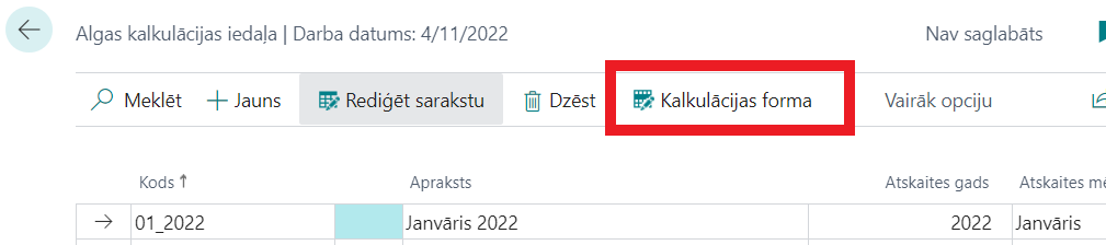 Pēc lauku aizpildīšanas tabulā, lai aizpildītu algas iedaļu konkrētam pārskata periodam, noklikšķiniet uz "Algas kalkulācijas iedaļas" →"Kalkulācijas forma".