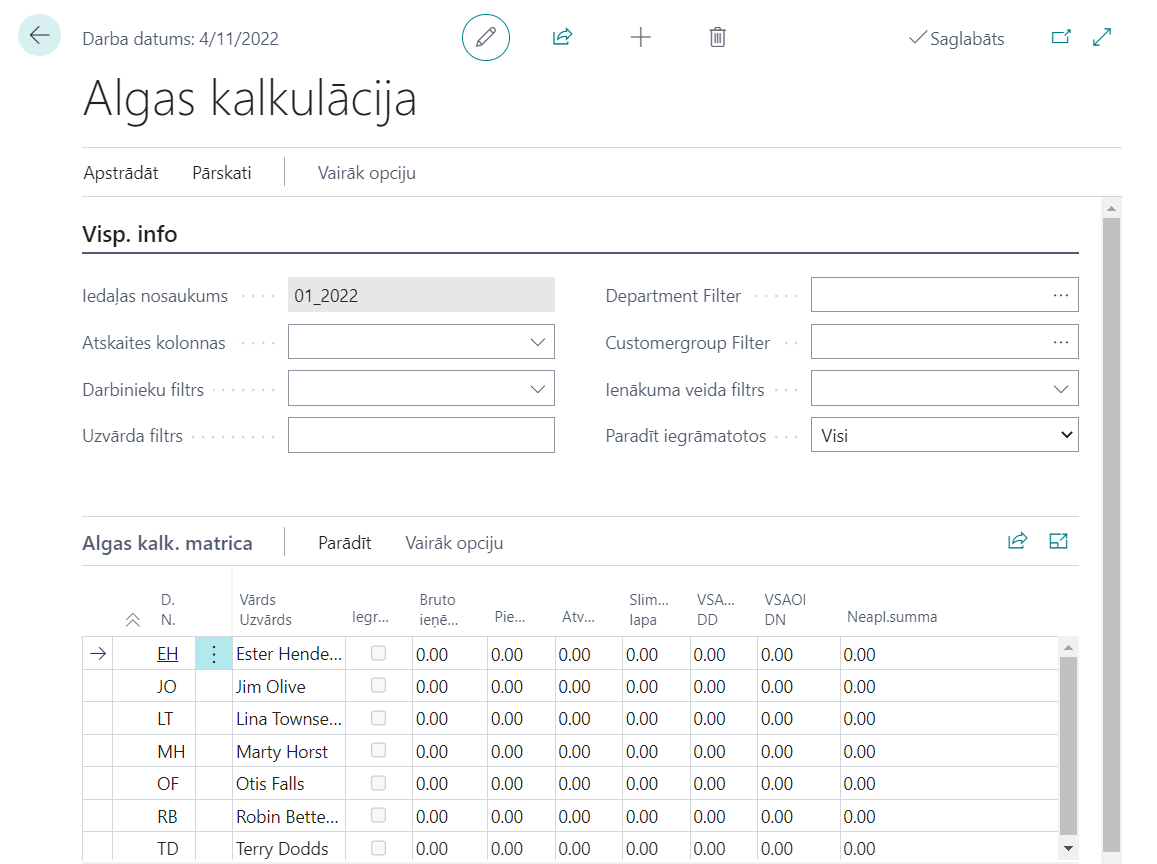 pēc datiem no darbinieka kartes (sadaļas “Algas Darbinieka kartes detaļas”) darba algas reģistrā tiks iekļauti dati par ienākumiem un prēmijām, kā arī ieturējumiem. Aprēķiniem tiks izmantoti darba laika uzskaites dati;