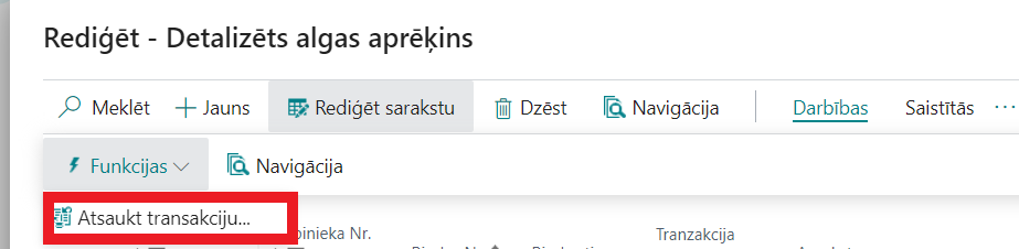 Algas aprēķini tiek koriģēti detalizēta algu sarakstā. Ja norēķins jau ir reģistrēts (grāmatots), nepieciešams atcelt grāmatošanu un stornēt virsgrāmatas ierakstus (ja algas uzstādījumos ir atzīmēts lauks "V/G Integrācija"). Lai to izdarītu, dodieties uz formu “Algas kalkulācija”, novietojiet kursoru uz vajadzīgā darbinieka un noklikšķiniet uz “Paradīt” → “Detalizēts algas aprēķins”. Pēc tam noklikšķiniet uz “Funkcijas” → “Atsaukt transakciju”.
