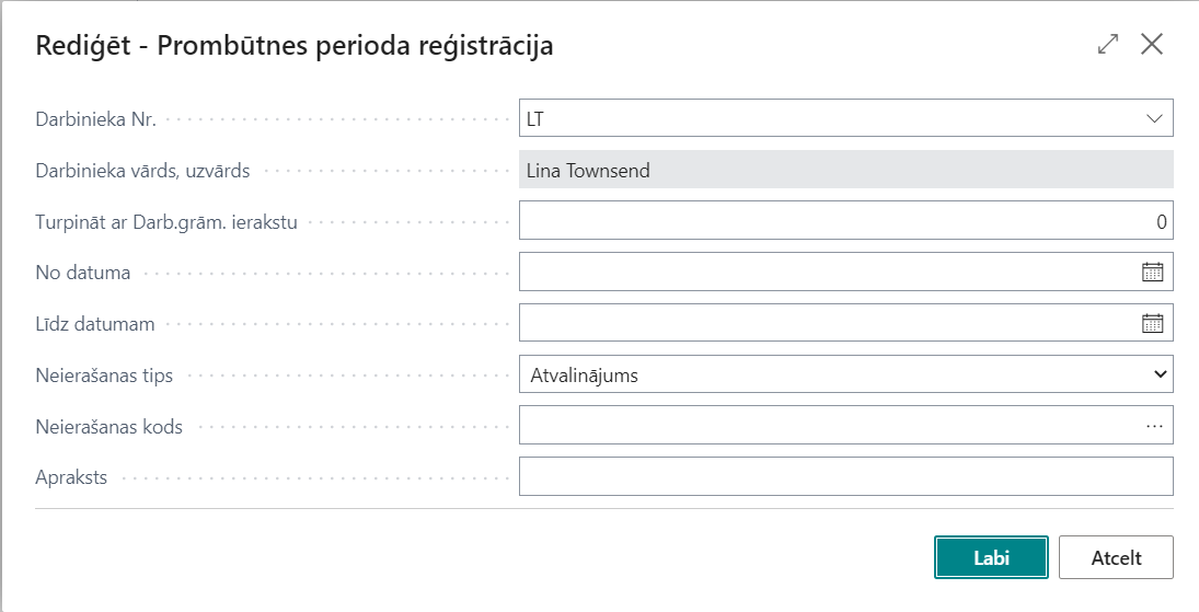 Turpināt ar Darb. grām. ierakstu | Turpināt jau reģistrētu periodu - prombūtnes periodi sistēmā tiek reģistrēti ar vienu transakcijas numuru, kas ļauj noteikt perioda sākumu un beigas. Ja nepieciešams reģistrēt turpinājumu (nevis jaunu periodu), tad šajā laukā ir jāizvēlas turpinātā perioda ieraksta numurs (izvēlēties no saraksta jebkuru ierakstu no reģistrētā prombūtnes perioda). | |