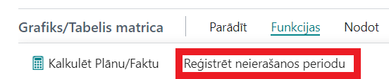 Lai reģistrētu atvaļinājumu vai slimības lapu, kā arī reģistrētu pilna laika prombūtni, ir jāizmanto prombūtnes perioda reģistrēšanas funkcija. Lai to izdarītu, noklikšķiniet uz “Grafiks / Tabelis” → “Funkcijas” → “Reģistrēt neierašanas periodu”.