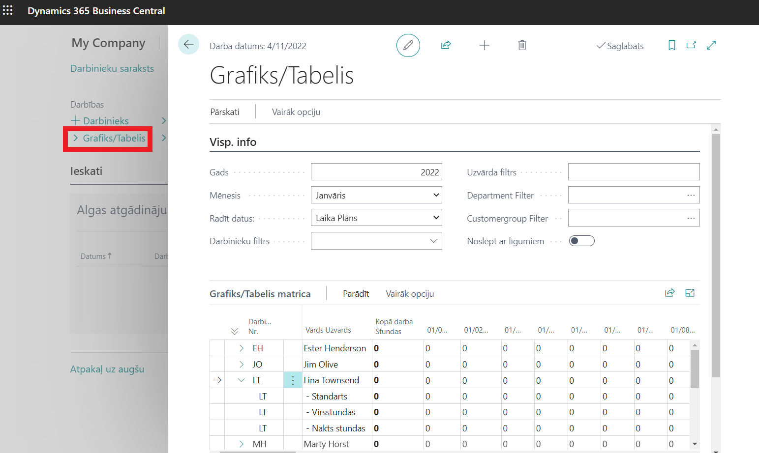Atveriet darba laika uzskaites formu (Grafiks / Tabelis);