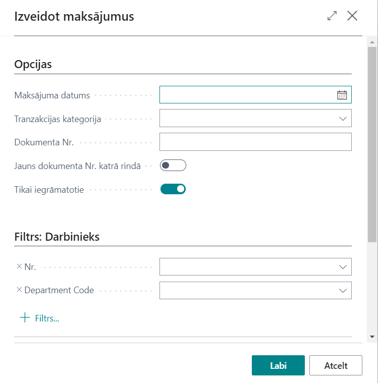 Tikai iegrāmatotie | Ja ir atzīmēts, tad, aprēķinot maksājuma summu, tiks ņemti vērā tikai darbinieka reģistrētie darījumi (atzīmēti ar “Iegrāmatots”). |