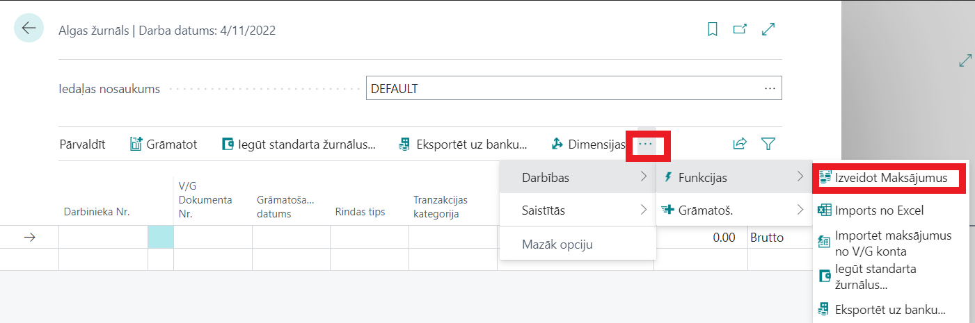 Aizpildot darbinieku algas žurnālu, var izmantot žurnāla rindu izveides funkciju. Lai to izdarītu, noklikšķiniet uz “Darbības” → “Izveidot maksājumus”