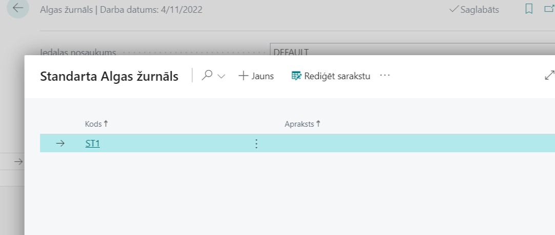 Žurnālā iespējams izmantot veidnes t.i. iepriekš aizpildītas žurnāla rindas (piemēram, darbinieku ikmēneša avansu saraksts). Lai izveidotu žurnāla veidni, žurnālā noklikšķiniet uz “Funkcijas” → “Iegūt standarta žurnālus”. Atvērtajā tabulā noklikšķiniet uz pogas "Jauns".
