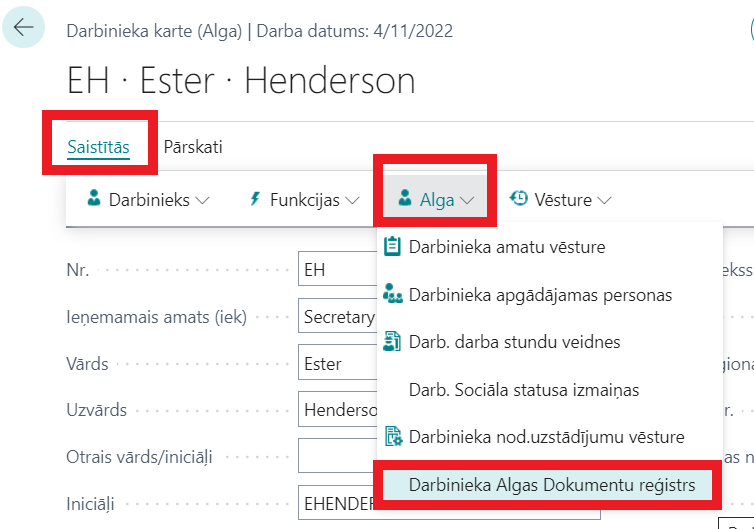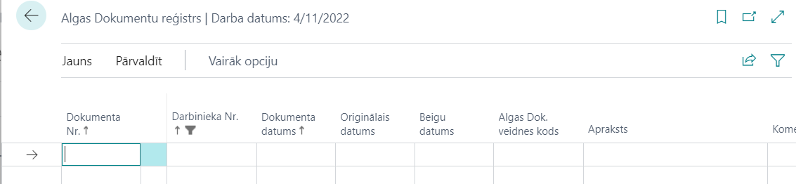 Lai atvērt šo tabulu, nospiediet “Darbinieka algas karte” →“Alga” →“Darbinieka Algas dokumentu reģistrs”.