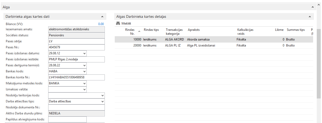 Algas ieraksti – reģistrēto darba algas transakciju tabula šīm darbiniekam, sk. sadaļu “Darba algas aprēķins”