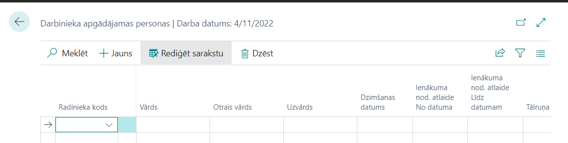 Tabula “Darbinieka apgādājamas personas” satur informāciju par reģistrētiem darbinieka apgādājamām personam. Lai atvērt šo tabulu, nospiediet “Darbinieka algas karte” →“Alga” →“Darbinieka apgādājamas personas”.