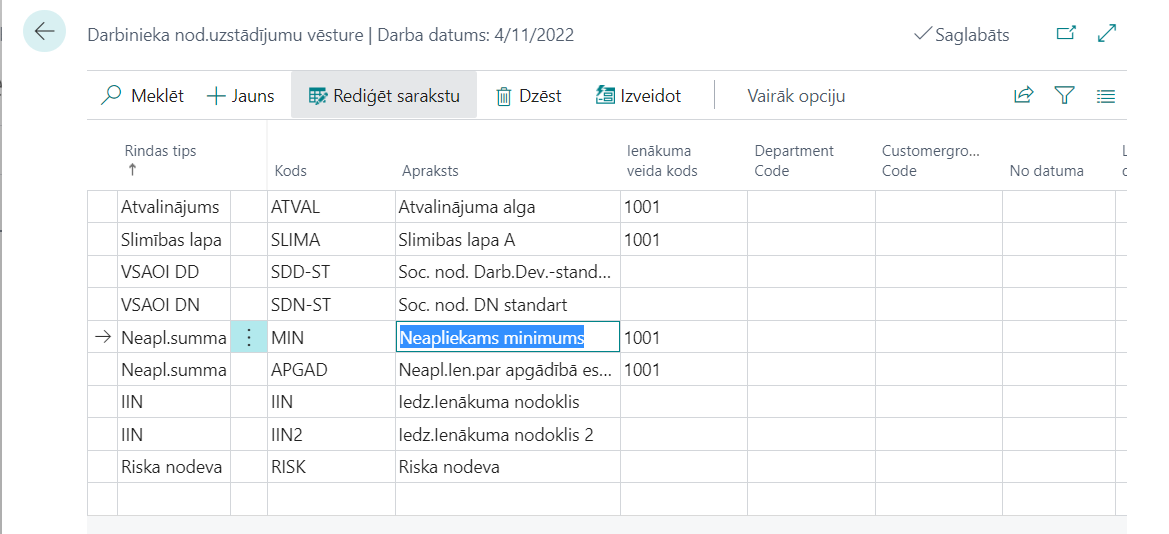 Tabulā uzrādīts transakcijas kods un periods, kad šīs kods (nodoklis, atvieglojums) tiek pielietots šīm darbiniekam. Šai tabulai jābūt aizpildītai katram darbiniekam sistēmā.