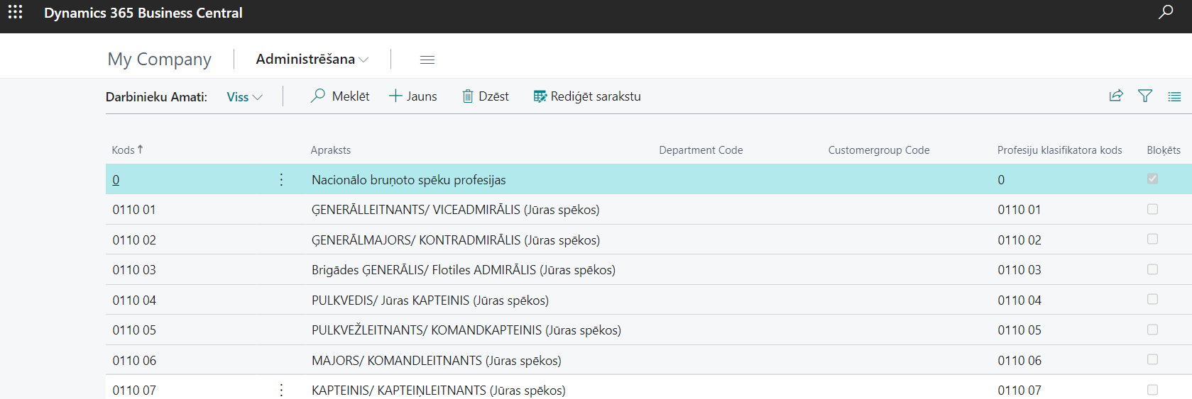 Tabula “ Darbinieku amati ” satur informāciju par amatiem, kurus izmanto uzņēmuma štatu sarakstā. Amatu kods tālāk būs uzrādīts darbinieku kārtiņā. Lai atvērt šo tabulu, nospiediet “Uzstādījumi”→“ Darbinieku amati”.