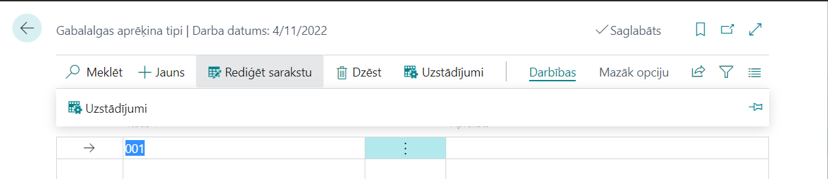 Tabula “Gabalalgas aprēķina tipi” satur informāciju par gabaldarba likmes aprēķiniem. Tālāk pie darbinieka kartiņas iestatījumiem, kartiņā varēs uzrādīt vienu no šīs tabulas kodu, lai izrēķināt gabaldarba algu (gabaldarba darba algas pielietošanai sistēmā vajadzēs reģistrēt saražoto produkcijas daudzumu, un aprēķinā šīs daudzums tiks reizināts ar likmi no šīs tabulas). Lai atvērt šo tabulu, nospiediet “Uzstādījumi”→“Gabalalgas aprēķina tipi”.