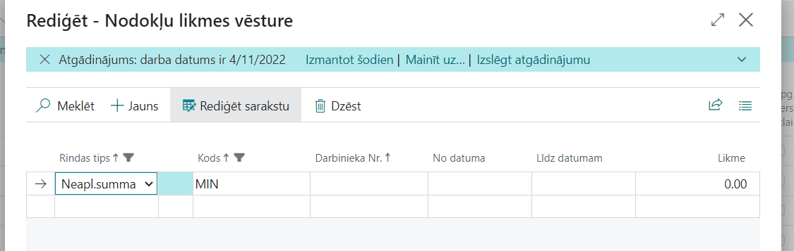 Visu nodokļu tipiem, ka arī neapliekamā ienākuma nodokļa atlaidēm, nepieciešams uzrādīt likmes. Nodokļu likmes jāievadā tabulā «Nodokļu likmes vēsture», ar noradīto šīs likmes pielietošanas periodu. Lai atvērt šo tabulu, nospiediet taustiņu “Uzstādījumi” → “Transakcijas kategorija” → “Likmes”. Lai uzrādīt likmi konkrētajām nodoklim, nepieciešams “Transakcijas kategorijā” ar kursoru izvēlēties nepieciešamu rindu.